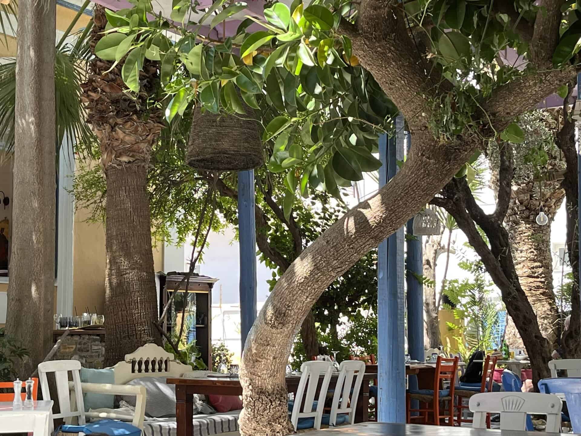ギリシャのクレタ島、アギオス・ニコラオスのシーフード・レストラン、Pelagos の庭にテーブルが並ぶ様子