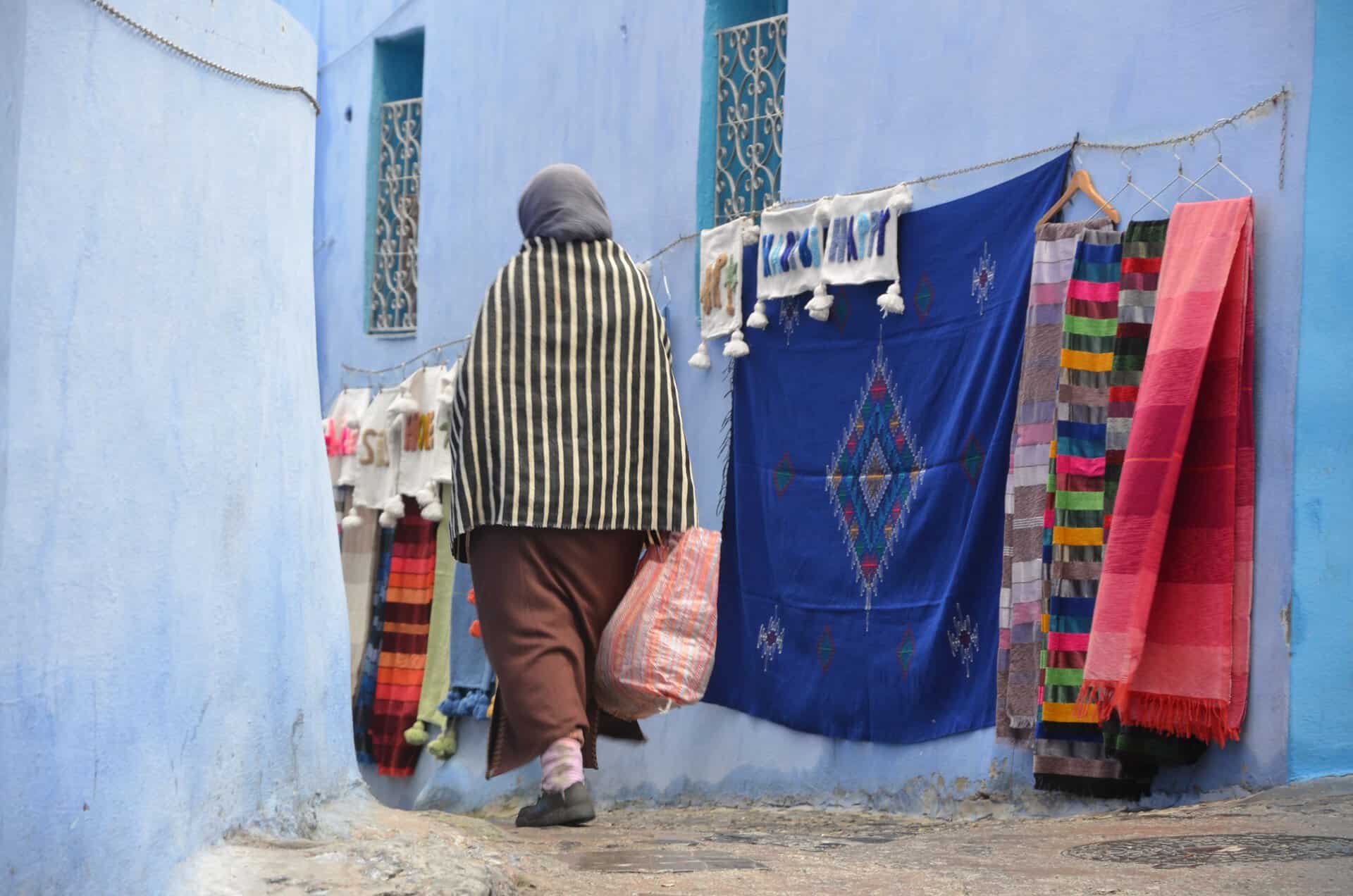 シャウエンのあるリフ山脈のこの地方では、ジェラバに加え、女性は赤い縞模様のウールの布を腰や肩に巻いていることがあります。
