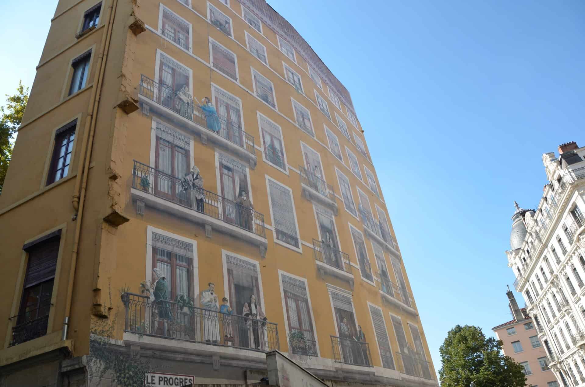 These trompe l’oeil paintings depict windows and verandas on old buildings, and the figures depicted are historical figures with ties to Lyon.