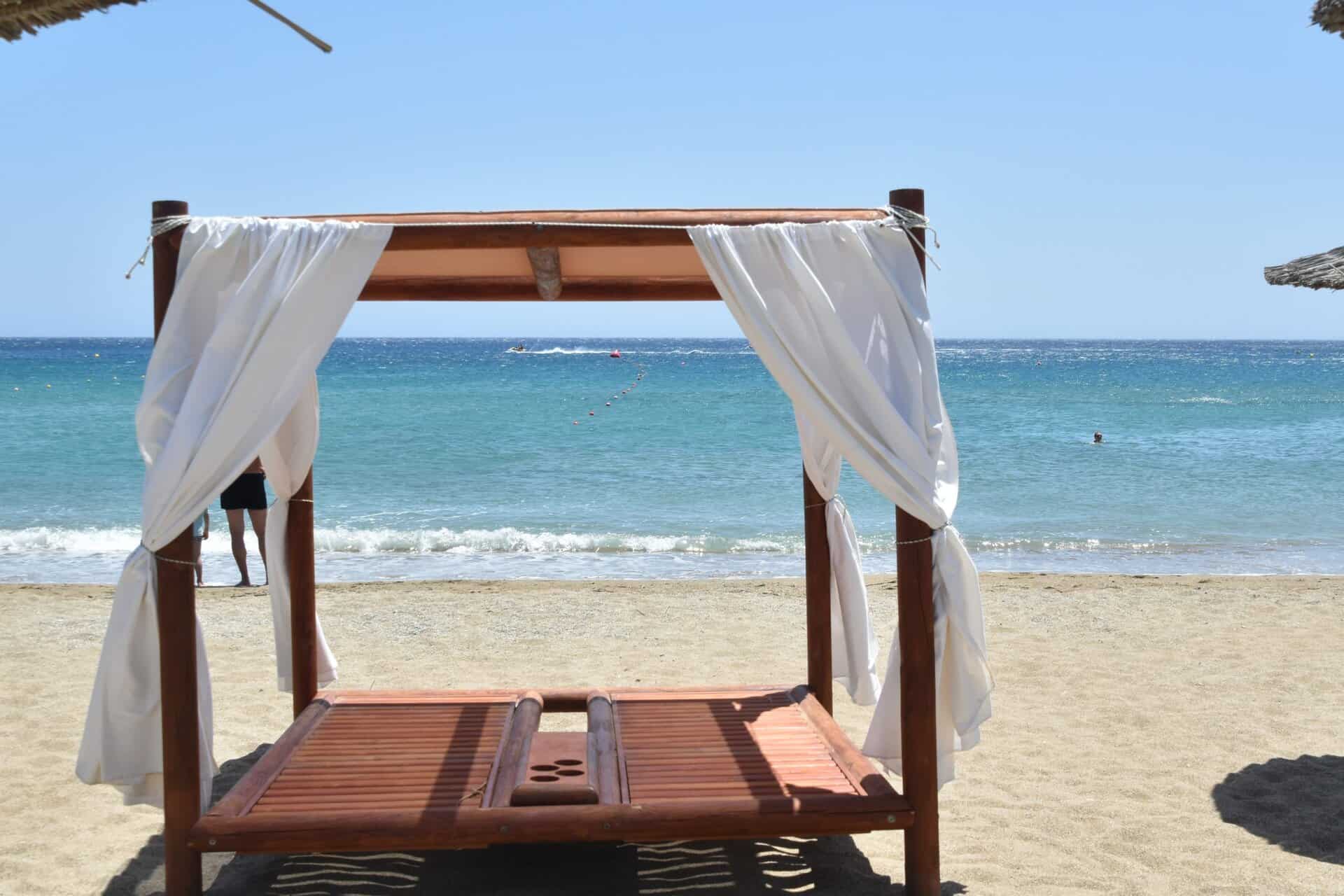 Beyond the row of €20 umbrellas, there was a free area, and even there, there were umbrellas set up without deck chairs, including ones shaped like a four-poster bed.